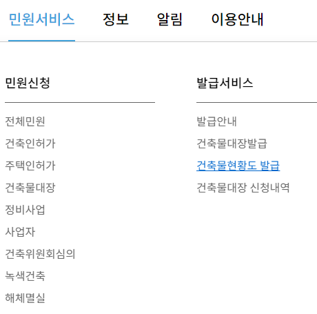 민원서비스에서 건축물대장발급 또는 건축물현황도 발급
