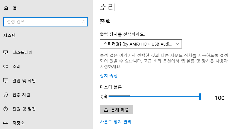 시작 > 설정 > 시스템 > 소리 > 사운드 장치 관리